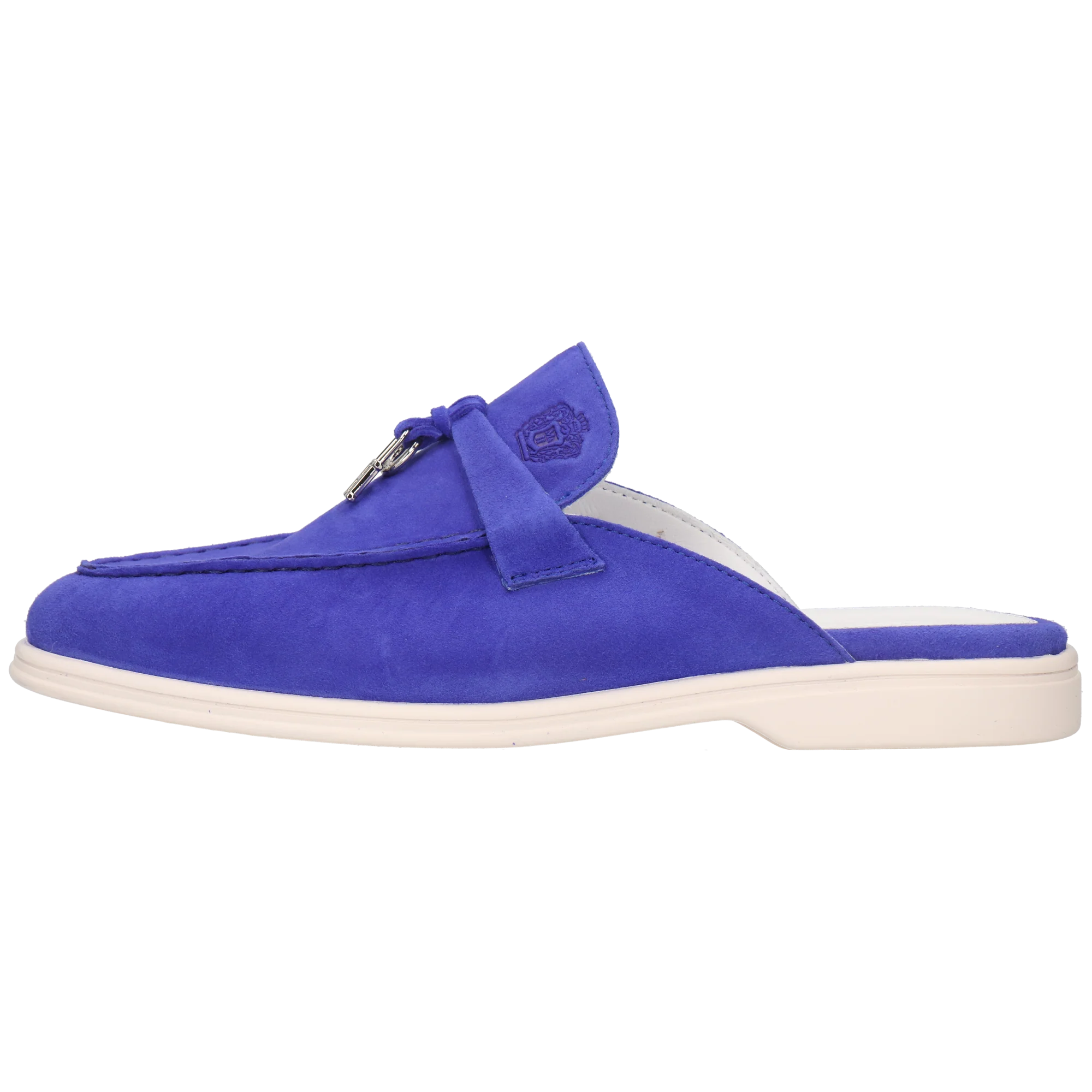 Die bequeme Pantoletten aus weichem Wildleder in Blau gehören als Teil unserer Adley-Kollektion zu unserer beliebtesten Designs. Mit ihrem offenen Design, dem einfachen Einstieg und der leichten Gummisohle bieten diese vielseitigen Adley 15 Pantoletten gemütlichen Komfort. In Ergänzung dazu, sorgt das Innere aus Innenfutter aus weißem Leder für Stabilität und geht dank der dekorativen Mini-M&H Charms auf der Vorderseite mit einem moischen Statement einher. Durch ihr praktisches Design und stilvollen Touch eignen sich diese eleganten Pantoletten perfekt für Frühlingsspaziergänge, Bürotage oder Stadtabenteuer.